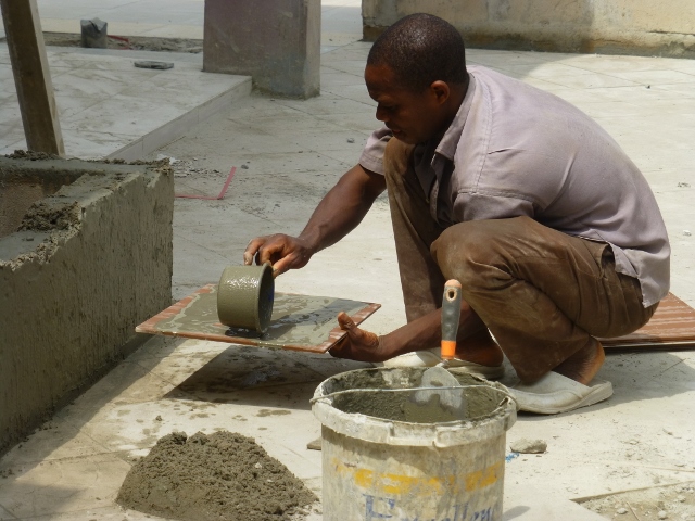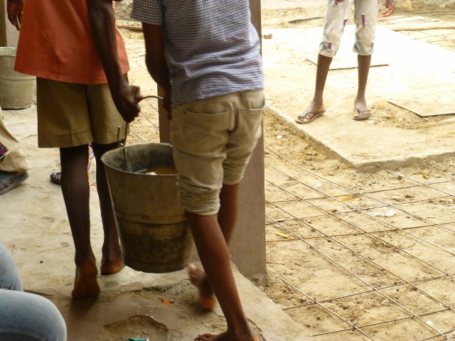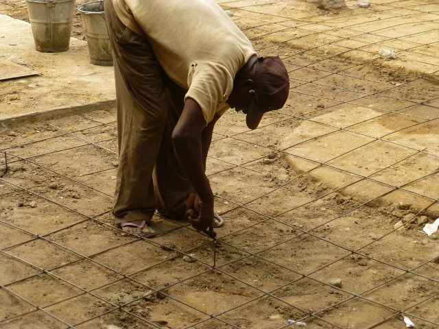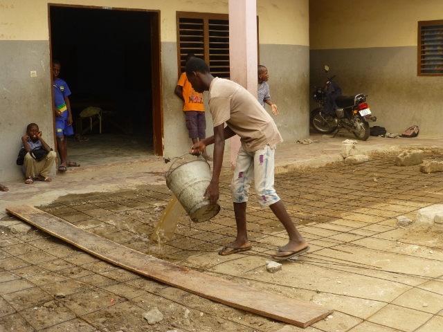 L'ingénieur Monsieur Djeglo explique qu'il faut couler une dalle de béton pour avoir une cour solide qui va durer au moins 50 ans. On prépare donc une dalle en béton armé.