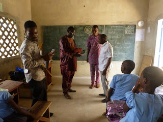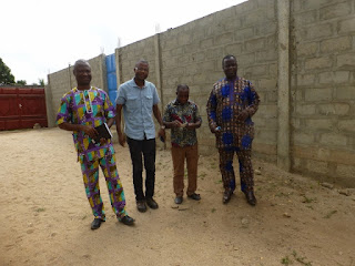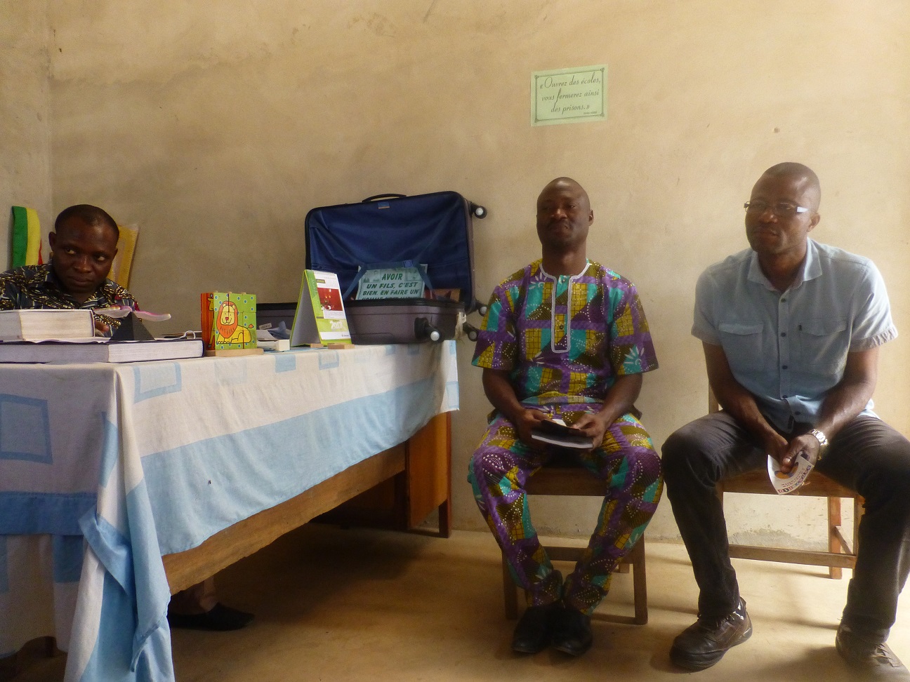Nouvelle école primaire privée HADEGNON. Ses responsables, deux fondateurs (à droite) et le directeur (à gauche) désirent que leurs élèves bénéficient d'un enseignement de l'espéranto. Ils sont entrés en contact avec "Savoir Sans Barrières" (SSB). Nous sommes ici au premier contact.