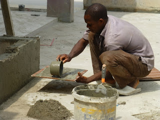 L'ouvrier au travail avec son niveau. Il faut en effet donner une légère pente à la dalle.