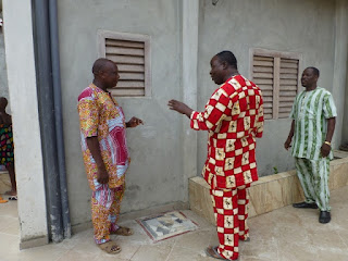 Le directeur de l'école, Monsieur LOKO, près du mur, et Monsieur TCHIKPE, président de SSB, ensemble, posent les premiers morceaux de la mosaïque.