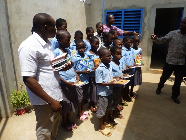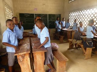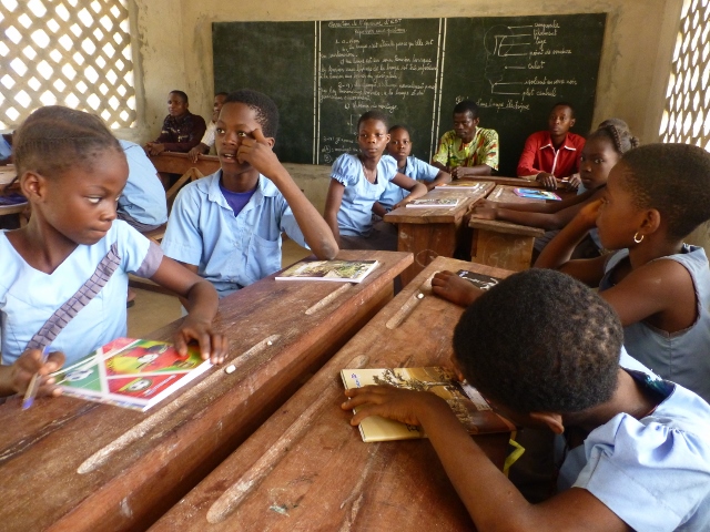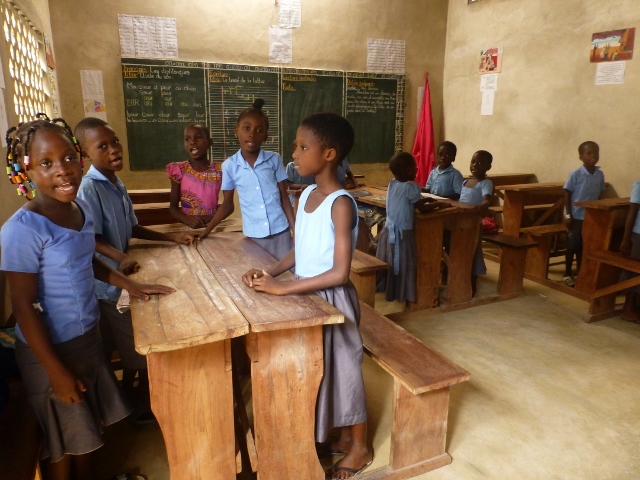 A droite Kingslim EDAH, qui va enseigner l'espéranto dans cette école régulièrement une fois par semaine à deux classes qui regroupent des enfants de 10 et 11 ans.