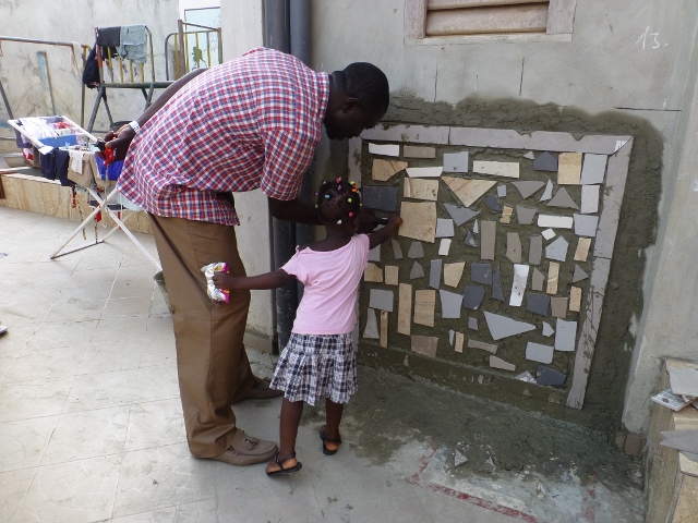 Ci-dessus et ci-dessous: le carreleur expose les différentes sortes de plaques que les enfants pourront utiliser pour construire la mosaïque. Celle-ci devait être à l'origine construite au sol dans un coin de la cour. Finalement, elle a été construite verticale sur une façade.